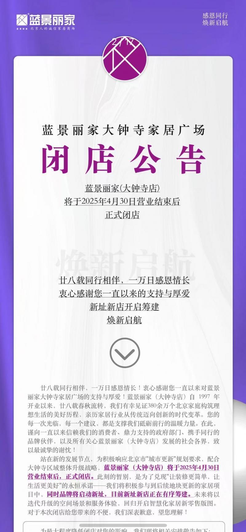 根据蓝景丽家闭店公告,蓝景丽家(大钟寺店)自1997年开业以来,亲历家居行业从传统迈向创新的时代变革。为响应北京市“城市更新”规划要求,配合大钟寺区域整体升级战略,其运营逾28年的大钟寺店将于2025年4月30日营业结束后,正式闭店。